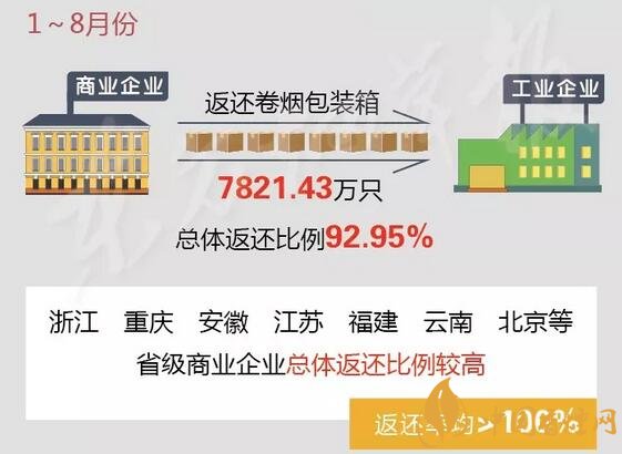 根據(jù)通報,1至8月份,行業(yè)商業(yè)企業(yè)累計向工業(yè)企業(yè)返還卷煙包裝箱7821.43萬只,總體返還比例為92.95%;