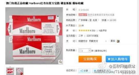 像之前在淘寶、京東上也有很多店鋪打著煙標(biāo)收藏的幌子,銷售卷煙制品,不過所銷售的卷煙是真是假就不得而知了。隨著近年來相關(guān)部分監(jiān)督力量的加強(qiáng),淘寶上也對違規(guī)銷售煙草制品的店鋪進(jìn)行了處理,現(xiàn)在很少能找的到了。以上就是香煙網(wǎng)小編為大家整理介紹的關(guān)于網(wǎng)上買香煙去哪個網(wǎng)站針對介紹的網(wǎng)上買煙的正規(guī)網(wǎng)站相關(guān)信息,更多了解點(diǎn)擊:2018年香煙網(wǎng)購商城郵寄新規(guī)定:每人最多可買2條