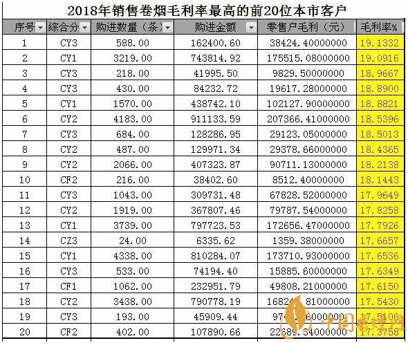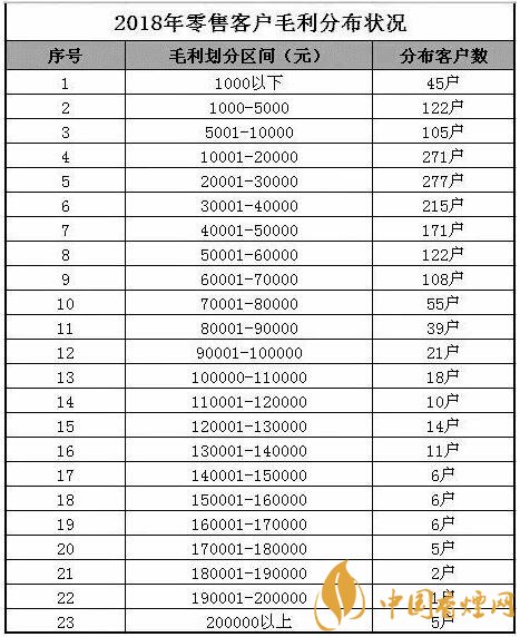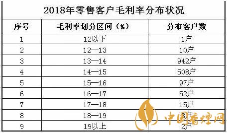 注:上表可以看出2018年卷煙商品毛利率超過(guò)超過(guò)19%的有2位客戶,其中數(shù)據(jù)顯示全市最低的零售客戶毛利率是11.67%。