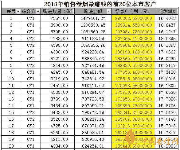 注:上表可以看出2018年卷煙商品獲利超過(guò)20萬(wàn)以上的有5位客戶,其中排名全省第一的客戶通過(guò)卷煙商品盈利在2018年超過(guò)了29萬(wàn)多,接近30萬(wàn)的卷煙商品盈利水平。