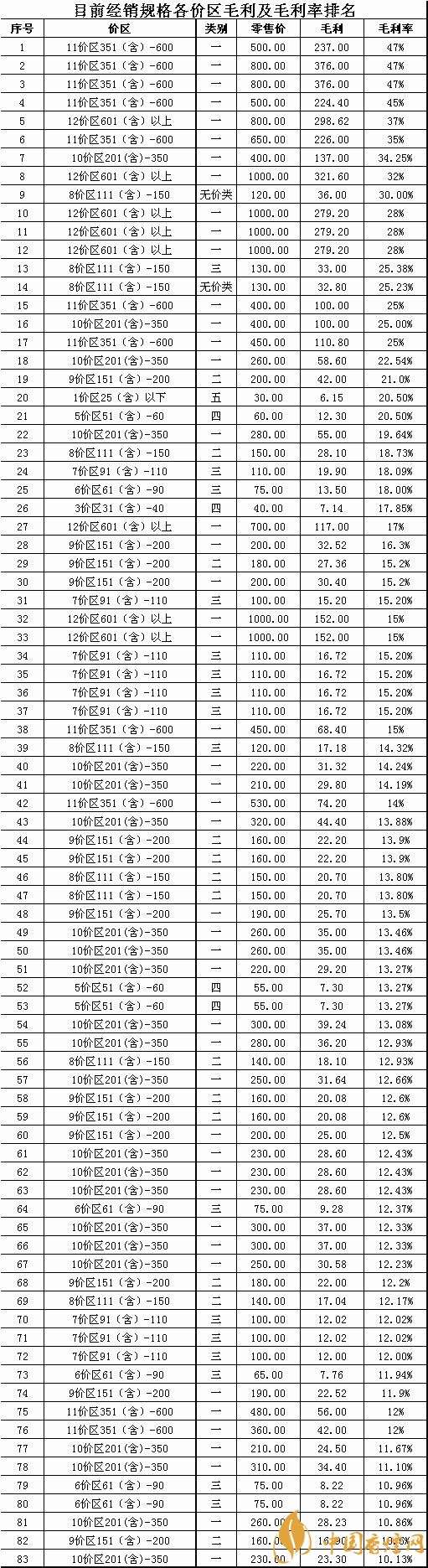 注:從目前全市經(jīng)銷的83個(gè)品牌批零差價(jià)可以看出,單品牌規(guī)格毛利率低于11%的僅有5個(gè)規(guī)格且全部高于10%的毛利率,部分溢價(jià)的規(guī)格產(chǎn)品毛利率已經(jīng)接近了50%,卷煙規(guī)格的平均毛利率達(dá)到了17.97%,然而這都預(yù)期的毛利,為什么真實(shí)的現(xiàn)狀是我們賺不到這應(yīng)該屬于我們自己的毛利率和毛利,是值得每一個(gè)卷煙經(jīng)營(yíng)者深思和考慮的問(wèn)題?為了保障大家的合法利益我們隱藏了商品名稱和商品編碼,有經(jīng)驗(yàn)的零售客戶對(duì)照價(jià)區(qū)和商品獲利水平就可以清晰的對(duì)商品進(jìn)行定位,具體對(duì)應(yīng)商品規(guī)格請(qǐng)參照2019版《卷煙零售客戶服務(wù)手冊(cè)》卷煙價(jià)格一覽表有詳解。
