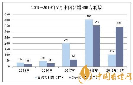 2016-2018年國(guó)內(nèi)HNB專利共計(jì)830件,其中2017年、2018年、2019年1-7月年新增HNB卷煙專利數(shù)(公開口徑)分別約為61件、355件、343件,技術(shù)推進(jìn)加快。