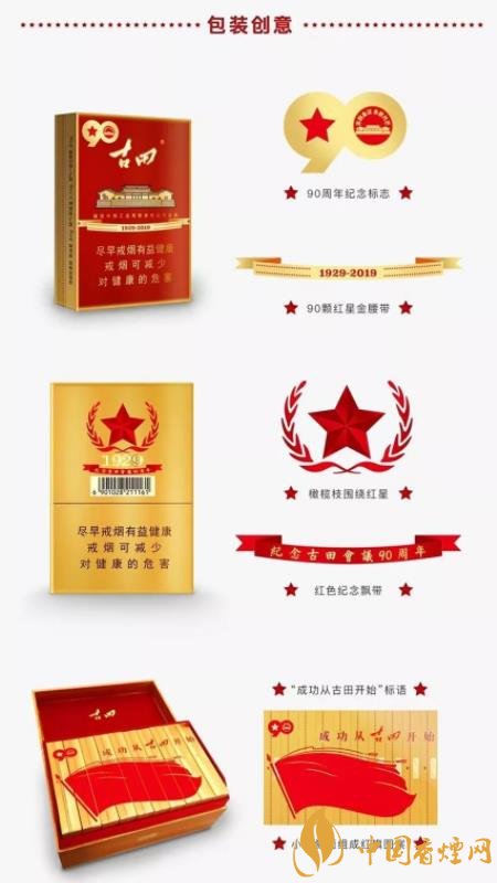 古田金中支90周年紀(jì)念版在包裝正面左上角有90周年紀(jì)念標(biāo)志,在煙包腰部位置有90顆紅星組成的金腰帶;在包裝背面有以橄欖枝圍繞的紅星和紅色紀(jì)念飄帶;打開(kāi)煙包可以看見(jiàn)清晰的“成功從古田開(kāi)始”的標(biāo)語(yǔ)和小盒側(cè)面組成的紅旗圖案。種種設(shè)計(jì),巧具匠心,輝映歷史。此時(shí)正值歲末年初元旦之際,古田金中支90周年紀(jì)念版是紅色卷煙中不可多得的禮贈(zèng)、過(guò)節(jié)佳選。
