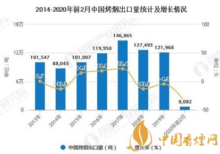 據(jù)中國海關總署數(shù)據(jù)顯示,2019年全年中國烤煙出口量達到了121968噸,累計下降4.3%。截止至2020年1-2月中國烤煙出口量達到8082噸,相比上年同期減少了4556噸,累計下降36.1%。