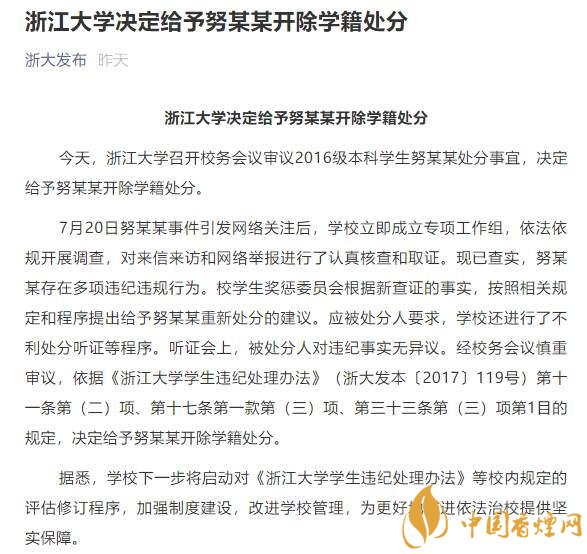 浙大表示,現(xiàn)已查實,努某某存在多項違紀違規(guī)行為。浙大學生獎懲委員會根據(jù)新查證的事實,按照相關(guān)規(guī)定和程序提出給予努某某重新處分的建議。應(yīng)被處分人要求,學校還進行了不利處分聽證等程序。聽證會上,被處分人對違紀事實無異議。經(jīng)浙江大學校務(wù)會議慎重審議,依據(jù)《浙江大學學生違紀處理辦法》(浙大發(fā)本〔2017〕119號)相關(guān)規(guī)定,決定給予努某某開除學籍處分。