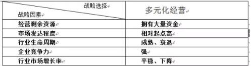 煙草行業(yè)的特殊性以及煙草發(fā)展趨勢來看,多元化是一種必然的選擇。煙草多元化經(jīng)營選擇多元化經(jīng)營的戰(zhàn)略因素包括:經(jīng)營剩余資源;市場發(fā)達(dá)程度;行業(yè)生命周期;企業(yè)競爭力;行業(yè)市場增長率。而煙草行業(yè)基本具備了主要戰(zhàn)略因素,如表可以做出比較。