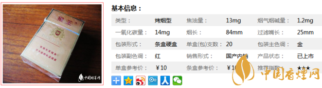 這款煙是猴王里面比較受歡迎的品種,銷量好,但是磨砂猴王好像能買到的地方不多。猴王磨砂香煙在10元檔標準煙草中,算是比較王牌的性價比了。經(jīng)香煙網(wǎng)小編市場調(diào)查價格為10元/包。