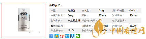 | 類型 :烤煙型 | 焦油量 :8mg | 煙氣煙堿量 :0.8mg | 一氧化碳量 :7mg |