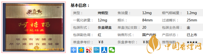 | 類型 :烤煙型 | 焦油量 :12mg | 煙氣煙堿量 :1.2mg | 一氧化碳量 :12mg |