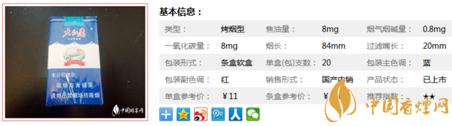 | 類型 :烤煙型 | 焦油量 :8mg | 煙氣煙堿量 :0.8mg | 一氧化碳量 :8mg |