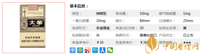 | 類(lèi)型 :烤煙型 | 焦油量 :10mg | 煙氣煙堿量 :1mg | 一氧化碳量 :10mg |