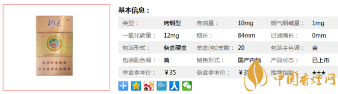 | 類型 :烤煙型 | 焦油量 :10mg | 煙氣煙堿量 :1mg | 一氧化碳量 :12mg |