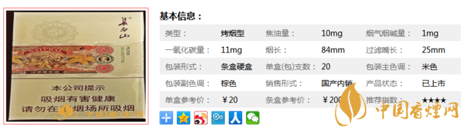 | 類型 :烤煙型 | 焦油量 :10mg | 煙氣煙堿量 :1mg | 一氧化碳量 :11mg |