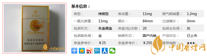 | 類型 :烤煙型 | 焦油量 :11mg | 煙氣煙堿量 :1.2mg | 一氧化碳量 :11mg |