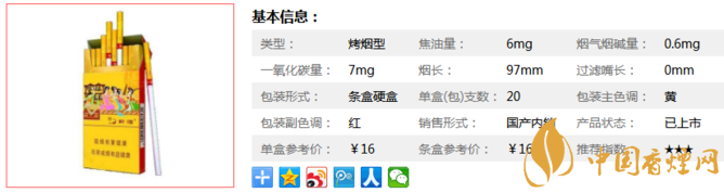 | 類型 :烤煙型 | 焦油量 :6mg | 煙氣煙堿量 :0.6mg | 一氧化碳量 :7mg |