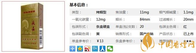 | 類型 :烤煙型 | 焦油量 :11mg | 煙氣煙堿量 :1.1mg | 一氧化碳量 :12mg |