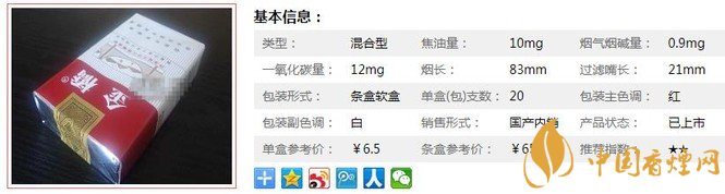 | 類型 :混合型 | 焦油量 :10mg | 煙氣煙堿量 :0.9mg | 一氧化碳量 :12mg |