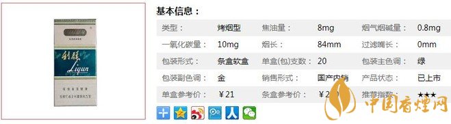 | 類型 :烤煙型 | 焦油量 :8mg | 煙氣煙堿量 :0.8mg | 一氧化碳量 :10mg |