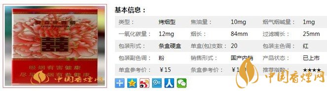 雙喜和喜煙支長84mm,過濾嘴長25mm,針對消費者口味特點構(gòu)建了新的研發(fā)平臺,綜合運用了調(diào)香最新技術(shù),進(jìn)一步強(qiáng)化卷煙“甜、柔、順”的上乘品質(zhì)特點。下面我們一起來看雙喜和喜的參數(shù)信息:焦油量:10mg. 煙堿量:1mg. 一氧化碳量:12mg.