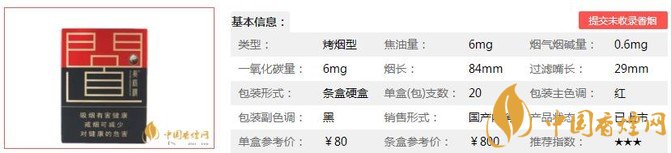 | 類(lèi)型 :烤煙型 | 焦油量 :6mg | 煙氣煙堿量 :0.6mg | 一氧化碳量 :6mg |