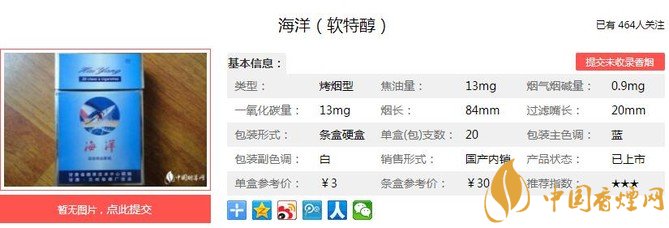 海洋軟特醇煙支長84mm,過濾嘴長:20mm,物美價(jià)廉,是蘭州人很喜歡的一種香煙。下面我們一起來看海洋軟特醇的參數(shù)信息:焦油量:13mg 煙堿量:0.9mg 一氧化碳量:13mg