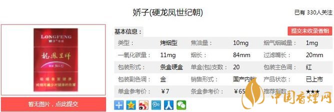 嬌子硬龍鳳世紀(jì)朝煙支長(zhǎng)84mm,過(guò)濾嘴長(zhǎng)20mm,金色內(nèi)襯紙紋路非常細(xì)膩,煙支7-6-7排列,煙嘴印有紅色龍鳳呈祥和金色世紀(jì)朝字樣。下面我們一起來(lái)看嬌子硬龍鳳世紀(jì)朝的參數(shù)信息:焦油量:10mg 煙堿量:1.0mg 一氧化碳量:11mg