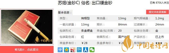 蘇煙(軟金砂C)俗名: 出口硬金砂,外觀包裝設(shè)計體現(xiàn)了時代感和高雅、華貴、時尚、氣派的風(fēng)格。煙絲金黃油潤,賞心悅目,香氣高雅充足,煙氣柔和豐滿,吃味舒適干凈,形成了“江蘇第一煙”柔、香、雅獨特風(fēng)格。經(jīng)香煙網(wǎng)小編市場調(diào)查蘇煙軟金砂C售價為28元/包。