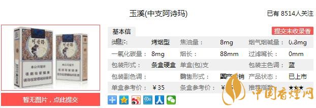 玉溪中支阿詩(shī)瑪煙支長(zhǎng)88mm,濾嘴的中部是阿詩(shī)瑪標(biāo)志性的側(cè)影頭像。濾嘴下部是上下兩個(gè)圓環(huán),中間正反印制著阿詩(shī)瑪和Ashima標(biāo)識(shí)。下面我們一起來(lái)看玉溪中支阿詩(shī)瑪?shù)膮?shù)信息:焦油量:8mg 煙堿量:0.8mg 一氧化碳量:8mg
