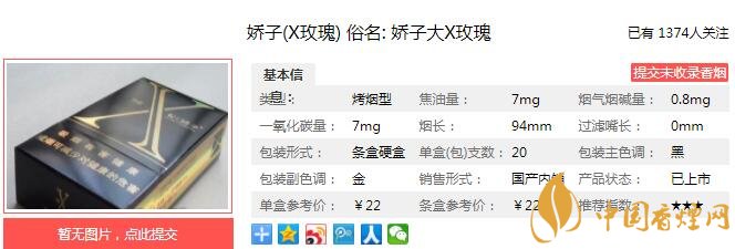 嬌子X玫瑰煙支長94mm,嬌子(X玫瑰)開啟方式比較特別,采用了底部開啟煙盒的方式。94mm的超長煙支,纖細、挺拔而不失雋秀。下面我們一起來看嬌子X玫瑰的參數(shù)信息:焦油量:7mg 煙堿量:0.8mg 一氧化碳量:7mg
