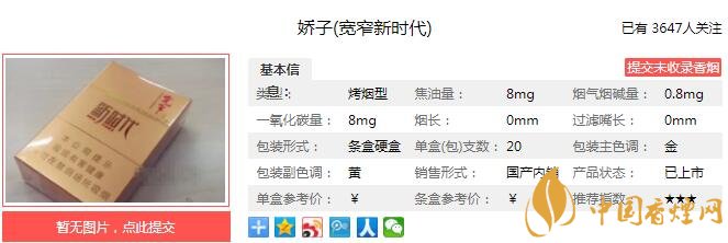 嬌子寬窄新時代具體煙支長度和過濾嘴長度都還沒有準確的數(shù)據(jù)。煙支濾嘴同樣以金色為主調(diào),但質(zhì)感偏粉偏軟一點。盒子上的V是紅色而煙支實物的V是白色,略意外。下面我們一起來看嬌子寬窄新時代的參數(shù)信息:焦油量:8mg 煙堿量:0.8mg 一氧化碳量:8mg