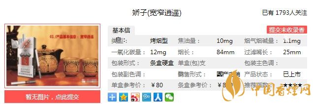 嬌子寬窄逍遙煙支長84mm,過濾嘴長25mm,煙支上只有寬窄字樣,兩顆爆珠的位置清晰可見,上香下甜。煙絲填充飽滿,彈性很好。下面我們一起來看嬌子寬窄逍遙的參數(shù)信息:焦油量:10mg 煙堿量:1.1mg 一氧化碳量:12mg