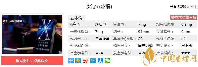 嬌子X(jué)冰爆煙支長(zhǎng)94mm,過(guò)濾嘴長(zhǎng)35mm,過(guò)濾嘴頂端是普通的海綿體結(jié)構(gòu),并無(wú)瓦楞槽,過(guò)濾嘴一側(cè)印有爆珠的標(biāo)識(shí),另一側(cè)印有X的LOGO,煙支整體比較精美。下面我們一起來(lái)看嬌子X(jué)冰爆的參數(shù)信息:焦油量:7mg 煙堿量:0.8mg 一氧化碳量:7mg