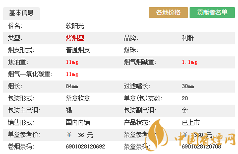 | 利群(西子陽(yáng)光) | 烤煙型 | 84mm 細(xì)支硬 | 310元/條 | 浙江中煙工業(yè)有限責(zé)任公司 |