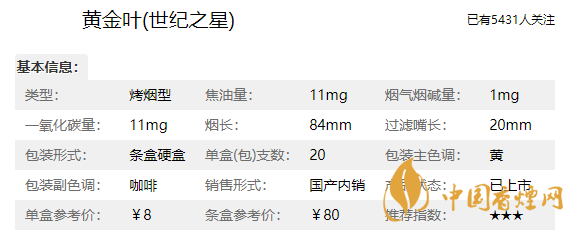 黃金葉香煙品牌定位為中式經(jīng)典醇香型烤煙,一烤透本香、二烤出凈香、三烤成醇香是它的工藝,這款世紀(jì)之星也是完美的繼承了品牌的意志,這款香煙品質(zhì)方面非常的好,那么我們在介紹這款黃金葉香煙價格表和圖片之前,先來了解一下黃金葉世紀(jì)之星多少錢一盒,它的零售參考價為8元/包。