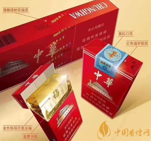 而轉(zhuǎn)包中華2018新年大吉香煙中華戊戌版,整條薄膜印刷有2018大吉字樣祝福語(yǔ),小包口花處有新年大吉和金色LOGO,大紅色的福字鋁箔。香煙全部為“3”字頭。