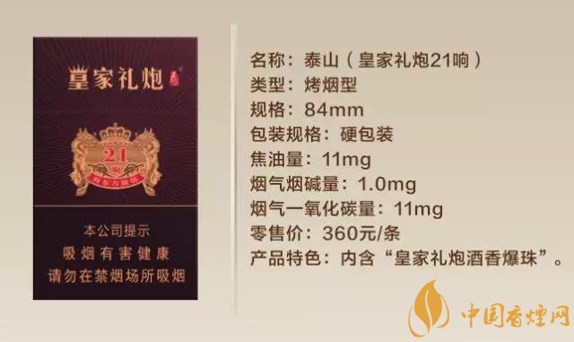 泰山(皇家禮炮21響)是山東中煙秉承中西禮儀文化,運(yùn)用創(chuàng)新科技精心打造。不僅有著豐富的文化內(nèi)涵,而且產(chǎn)品極具特點(diǎn),在濾嘴中添加了“皇家禮炮21年”頂級(jí)威士忌的爆珠。泰山煙新品多少錢(qián)?2018皇家禮炮21響多少錢(qián)一盒 皇家禮炮21響香煙售價(jià)36元/包
