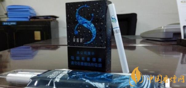 這款香煙正面外觀來看給人的第一印象它就是一款涼煙,炫酷純黑的底色搭配晶亮水滴為主色調(diào),同時冰藍顏色的抽象冰塊圖案形成了一個數(shù)字“8”形狀,讓人覺得涼爽的同時也突出了產(chǎn)品LOGO。