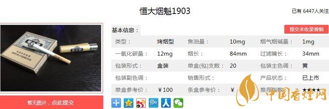 1948年,為慶祝中國恒大企業(yè)公司的成立,東亞煙草廠創(chuàng)立了“恒大”牌香煙,并委托天津華中印刷事務所的著名設計師陳嘉祥設計了“恒大”牌煙標。1956年,恒大煙草廠并入天津卷煙廠。“恒大牌”卷煙成為天津卷煙廠的主打產品。下面就由香煙網(wǎng)小編帶大家一起來了解恒大煙魁1903的相關信息。