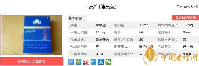 一品梅佳品藍(lán)香煙曾經(jīng)是很多人心中的經(jīng)典,香氣豐富飄逸,煙氣柔和,吸味醇和,余味純凈舒適,回味甜感。很多人稱它藍(lán)一品,在煙民心中的地位很不錯(cuò),但目前已經(jīng)很難找到了。經(jīng)香煙網(wǎng)小編市場(chǎng)調(diào)查一品梅佳品藍(lán)售價(jià)為10元/包。