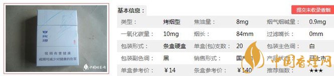 | 煙長:84mm | 過濾嘴長:25mm | 包裝形式:條盒硬盒 | 單盒(包)支數(shù):20 |