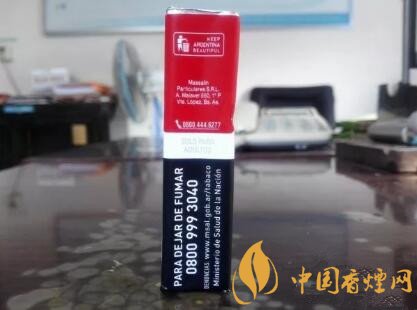 條形碼是阿根廷本國。下圖的煙盒側(cè)面文字內(nèi)容,不能直觀地看出生產(chǎn)地就是阿根廷。從上至下的內(nèi)容,基本上是菲莫公司名稱、過濾嘴類型、三項(xiàng)理化指標(biāo)數(shù)值、理化指標(biāo)數(shù)值含量隨溫濕度環(huán)境所改變、阿根廷工業(yè)等。