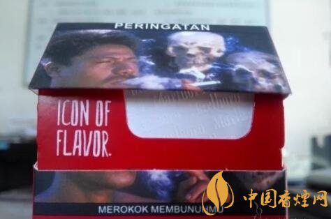 煙盒內(nèi)襯骨架上印制的“ICON OF FLAVOR”,直譯為‘風(fēng)味標(biāo)志",應(yīng)該指的是印尼硬紅萬(wàn)那濃郁的混合氣味。錫紙上的Marlboro字體效果,有如浮雕般凸起。