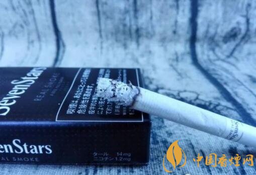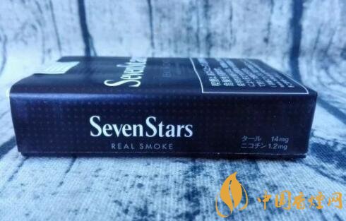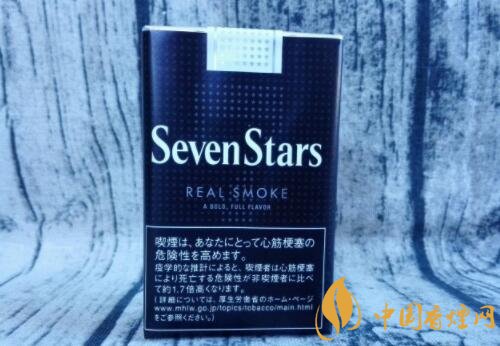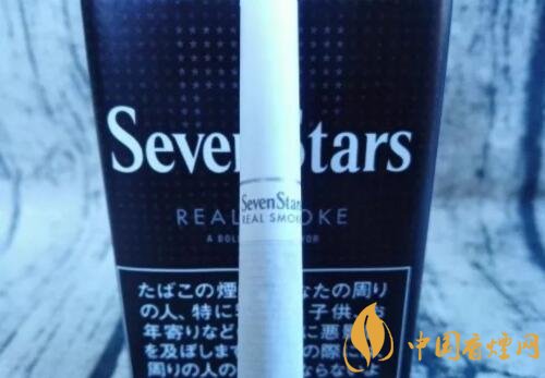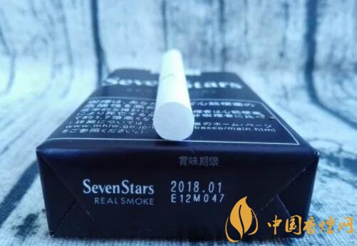 煙盒的正反及左右兩側均以白色的小五角星為圖案,橫平豎直地排列開來。與其它Seven Stars版本一樣,位于煙盒正反兩面中間都有阿拉伯數(shù)字“7”的標識。REAL SMOKE,直譯成中文是“真煙,真正的香煙”之意。A BOLD FULL FLAVOR,中文意思是“煙味十足”。綜合意思,是說此款日稅黑七星的品質之高。