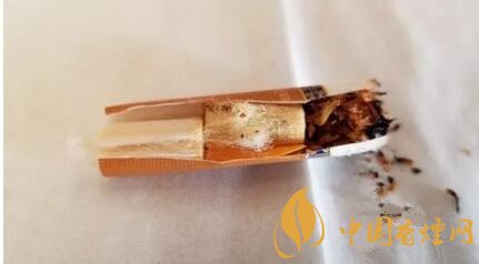剖開濾嘴,為兩段式濾嘴。濾嘴絲束的總長恰好到水松紙那圈回字紋之處。降焦孔開在了兩段濾嘴絲束的交界處。前段絲束間雜有細小的棕黃色顆粒。這是云煙新的濾嘴技術,顆粒物為云南地產(chǎn)古樹普洱茶萃取物。