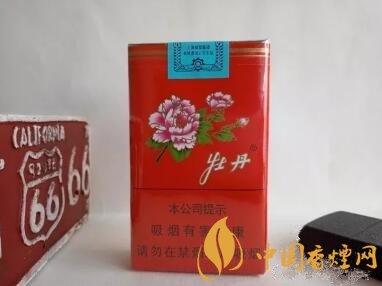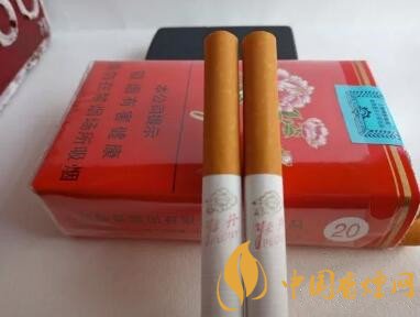 煙嘴顏色是黃色,上面隱約可以看到一些白色的小點,煙支上面印有牡丹的圖案和logo。