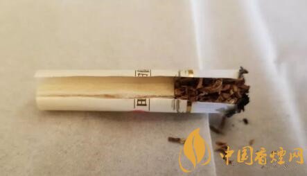 剖開(kāi)濾嘴,為一段式的醋酸纖維絲束。沒(méi)有開(kāi)降焦孔,絲束顏色淺黃,如此填充緊實(shí)的煙支,很不錯(cuò)!絲束上有條帶狀色深帶,是豎紋盤(pán)紙導(dǎo)氣所致。
