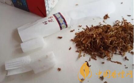 拆開(kāi)一支看到煙絲非常的碎,而且也不是很整齊,煙嘴分為兩段,上面一段外面是這樣褶皺的紙包裹著,形成了看到的溝槽式濾嘴,而且在棉花里可以看到一些顆粒。