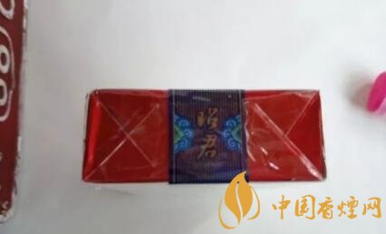 煙盒頂部有藍(lán)色條紋的封簽紙,上面寫(xiě)著昭君二字,旁邊是一些特色花紋點(diǎn)綴。底部就簡(jiǎn)單了,大青山的logo,山還是用象形字表示的。