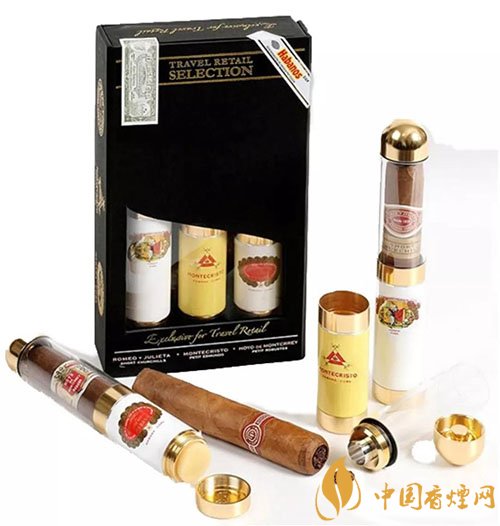 這是2008年推出的一個版本,是旅游零售系列的第三個版本,里面包含了好友、蒙特、羅密歐與朱麗葉三個品牌的三支雪茄,每支雪茄都放在一個獨立的保濕管里面。