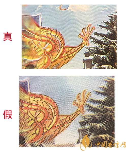 真煙小盒正面龍紋和松枝印刷清晰,色彩飽和度高,有立體感;假煙小盒正面龍紋和松枝印刷模糊,無立體感,且有粗糙圓形圖案。